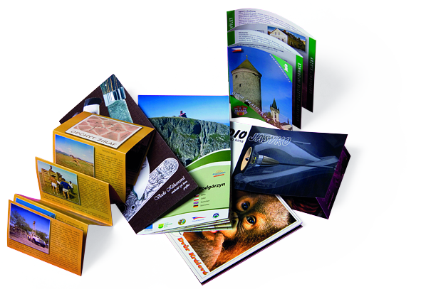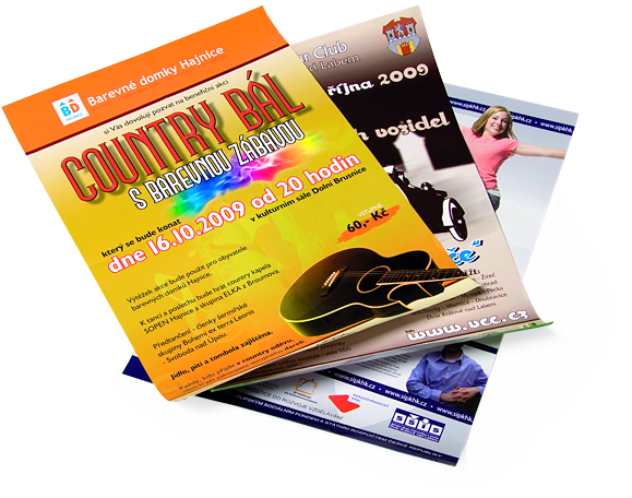Nabízíme zpracování širokého spektra různých letáků, skládaček, plakátů a prospektů v mnoha variabilních provedeních od jednobarevných až po náročné plnobarevné tisky. Tyto výrobky lze dále zušlechťovat tiskovým lakem či laminací, bigovat, falcovat, perforovat i vysekávat.