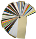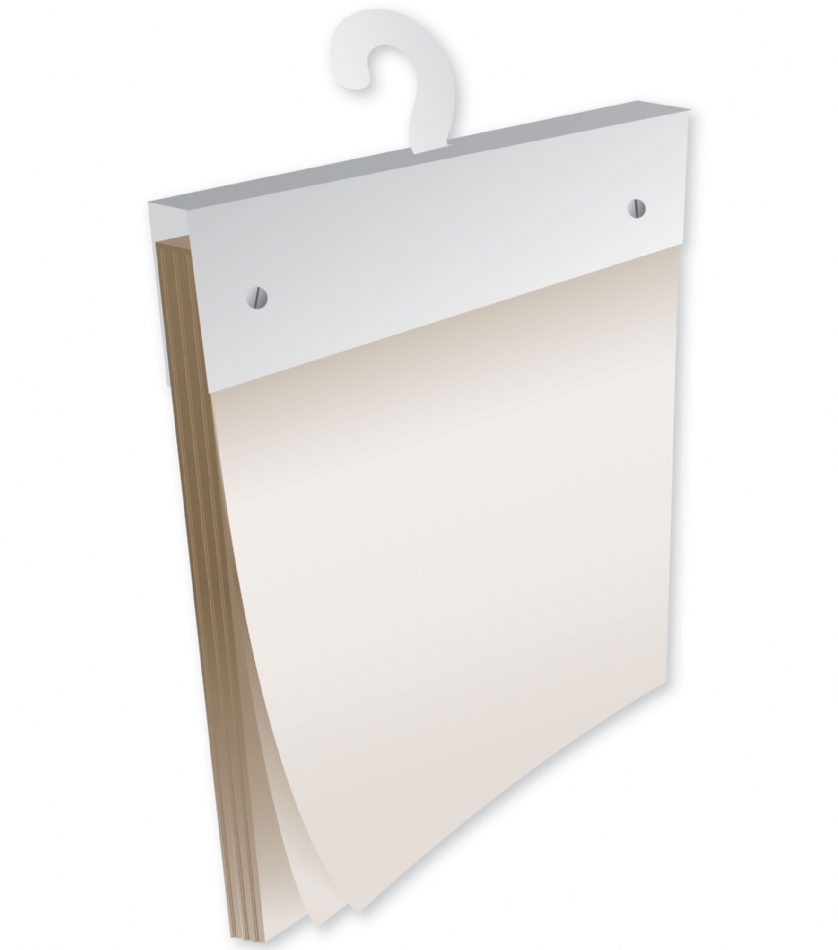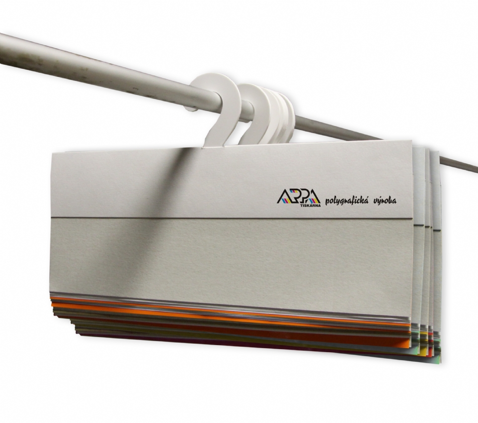 složené z jedné části, materiály určené k výrobě a ke kompletaci vzorníku se naděrují a upevní k ramínku pomocí knihařských šroubů, ramínko je možné potisknout libovolnou grafikou (logo, kontaktní údaje, výrobní zaměření apod.) a je opatřené háčkem k zavěšení